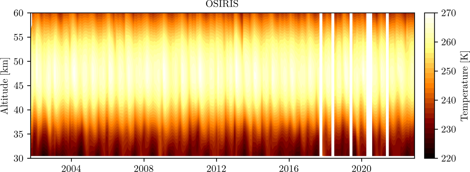 A new upper stratospheric (35–60 km) temperature data product has been produced using OSIRIS limb-scattered spectra that now spans over 22 years. Temperature is calculated by first estimating the Rayleigh scattering signal and then integrating hydrostatic balance combined with the ideal gas law. Uncertainties are estimated to be 1–5 K, with a vertical resolution of 3–4 km. Correlative comparisons with the Atmospheric Chemistry Experiment Fourier Transform Spectrometer (ACE-FTS) and the Microwave Limb Sounder on Aura (MLS) are consistent with these uncertainty estimates and generally have no regions of statistically significant drift. The temperature data product is publicly distributed as part of the recently released OSIRIS v7.3 data products. An example of the produced data is shown in Figure 1. The technique differs from previous techniques in that multiple scattering is included rigorously in the forward model, with a novel method to estimate the amount of upwelling radiation.