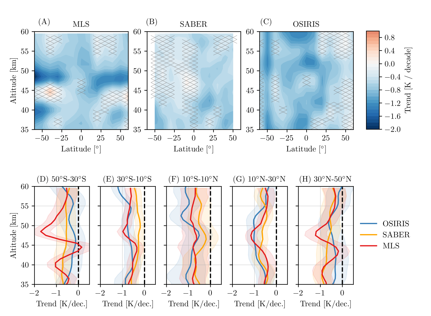 Temperature trends in the upper stratosphere, particularly above ∼ 45 km, are difficult to quantify due to a lack of observational data with high vertical resolution in this region that span multiple decades. The recent v7.3 upper-stratospheric (35–60 km) temperature data product from the Optical Spectrograph and InfraRed Imager System (OSIRIS) includes over 22 years of observations that can be used to estimate temperature trends. The trends in OSIRIS temperatures over 2005–2021 are compared to those from two other satellite limb instruments: Sounding of the Atmosphere using Broadband Emission Radiometry (SABER) and Microwave Limb Sounder (MLS). We find that the upper stratosphere cooled by ∼ 0.5 to 1 K per decade during this period. Results from the three instruments are generally in agreement. By merging the OSIRIS observations with those from channel 3 of the Stratospheric Sounding Unit (SSU), we find that the stratosphere cooled at a rate of approximately −0.6 K per decade between 1979 and 2021 near 45 km, in agreement with earlier results based on SSU and MLS. The similarity between OSIRIS temperature trends and those from other records improves confidence in observed upper-stratospheric temperature changes over the last several decades.