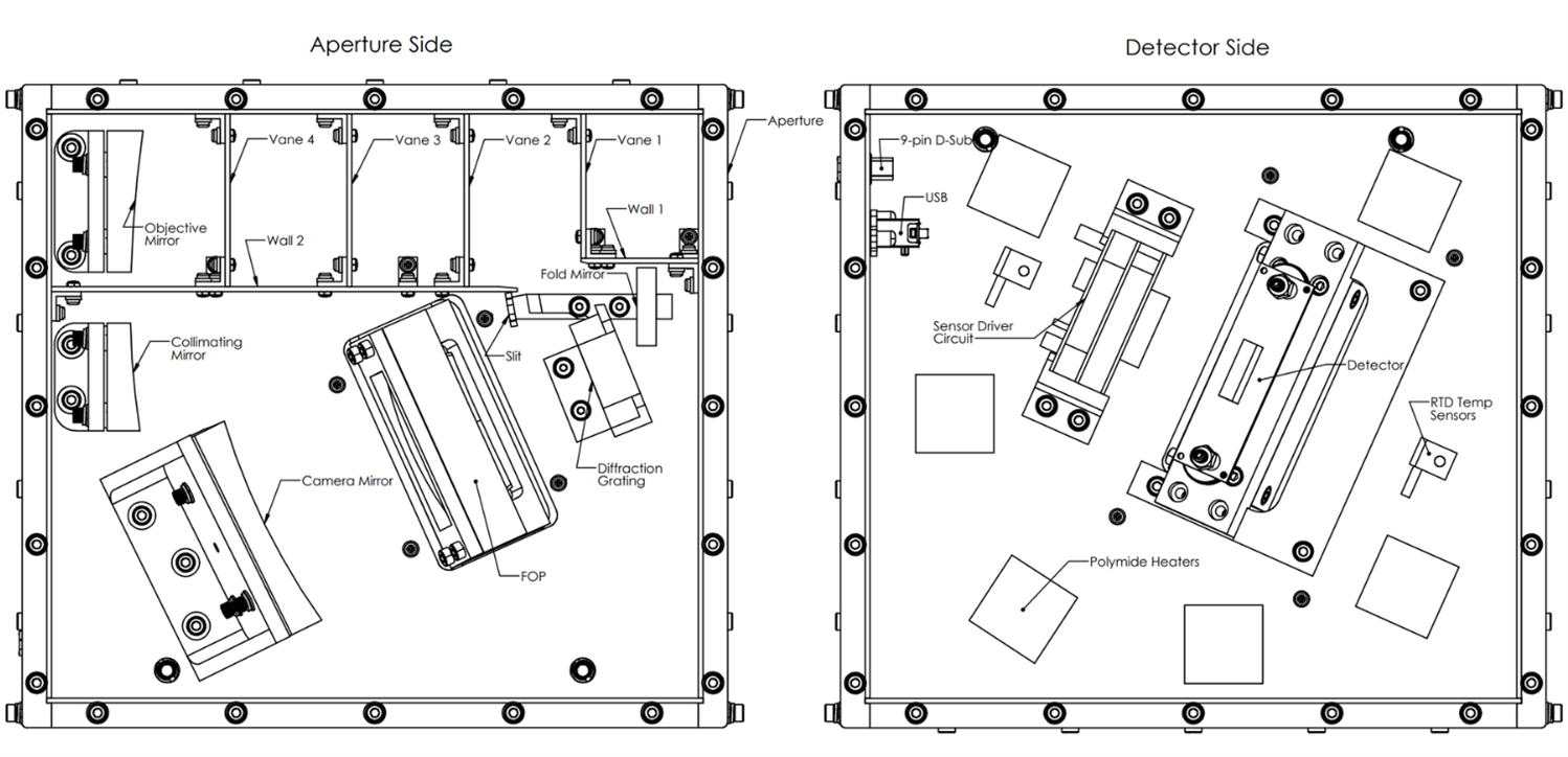 Designed and built at USask, OSIRIS-3’s optical unit features a compact optical layout built to withstand the thermal cycling and low pressure environment of a cubesat flight or a stratospheric balloon flight. The design uses an off-axis telescope and slit assembly that defines the instrument field of view while minimizing stray-light contamination. As in the OSIRIS design, the cubesat optical design also utilizes a grating and custom field-flattening optics. The figure below show the layout of the optical unit.
